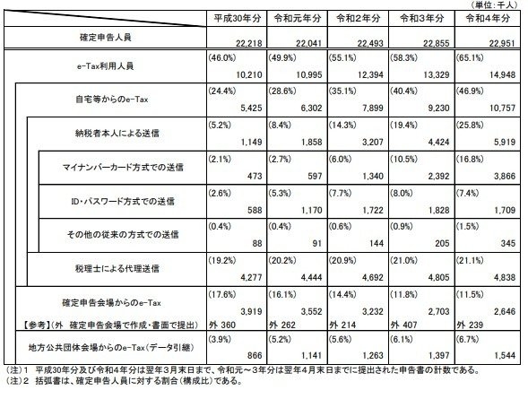 国税庁HP『確定申告書等作成コーナー』や各種会計ソフトを利用して自宅から納税者本人により e-Tax で申告書を提出した方は 592 万人で、令和3年分の約 1.3 倍、平成 30 年分の約5倍に増加し、確定申告会場で申告書を作成・提出した方(289 万人)の2倍を超え、自宅から提出する方が増えました。