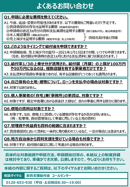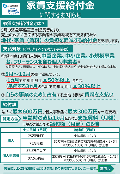 2020年5月の緊急事態宣言の延長等により、売上の減少に直面する事業者の事業継続を下支えするため、地代・家賃(賃料)の負担を軽減する給付金が支給される制度です。