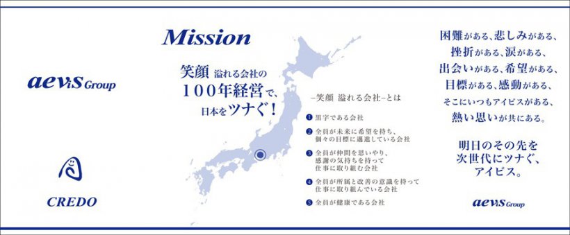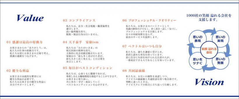クレド クレドとは、ラテン語で「志」「信条」「約束」を意味する言葉です。 価値あるサービスの提供と顧客満足度向上のために、スタッフでクレドを作成し、クレドカードを身に付け、クレド経営を徹底しています。 クレドカード表紙 Mission 笑顔溢れる会社の100年経営で、日本をツナぐ! Vision 1000社の笑顔溢れる会社を経営支援します。 Value →クレドカードの全文「経営理念」ページへ